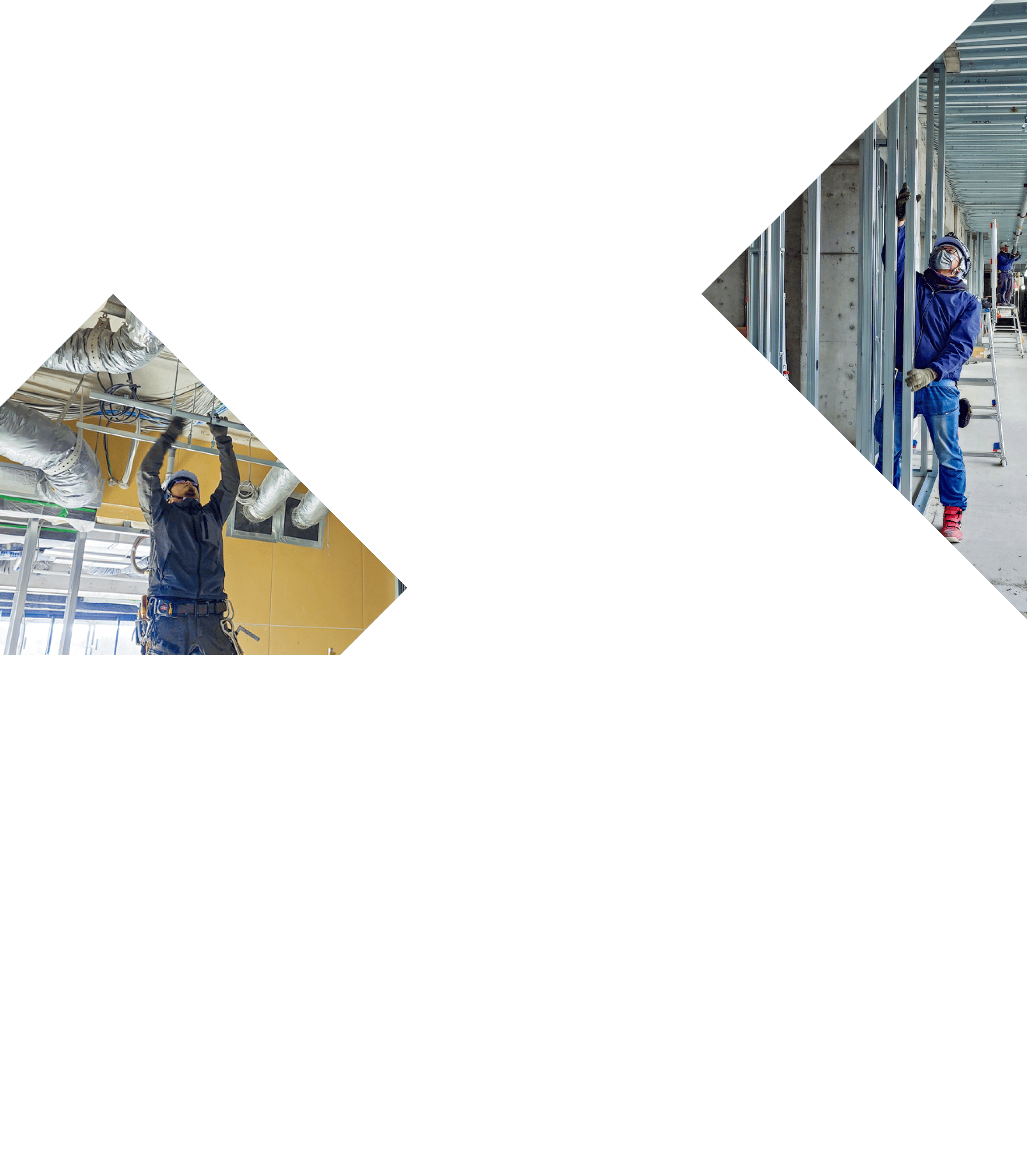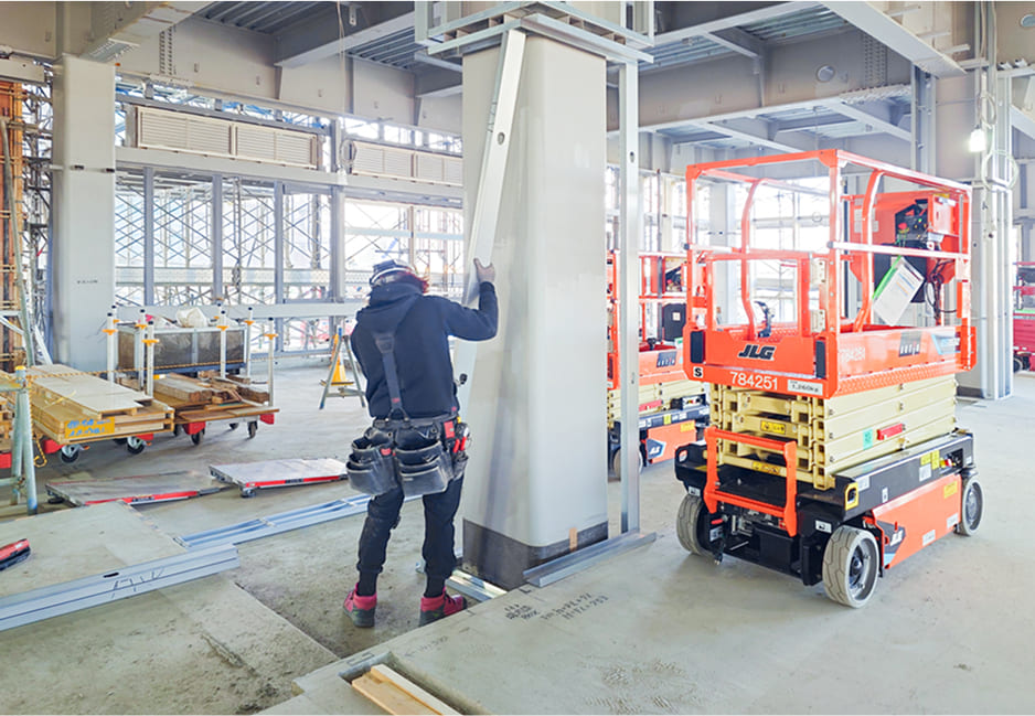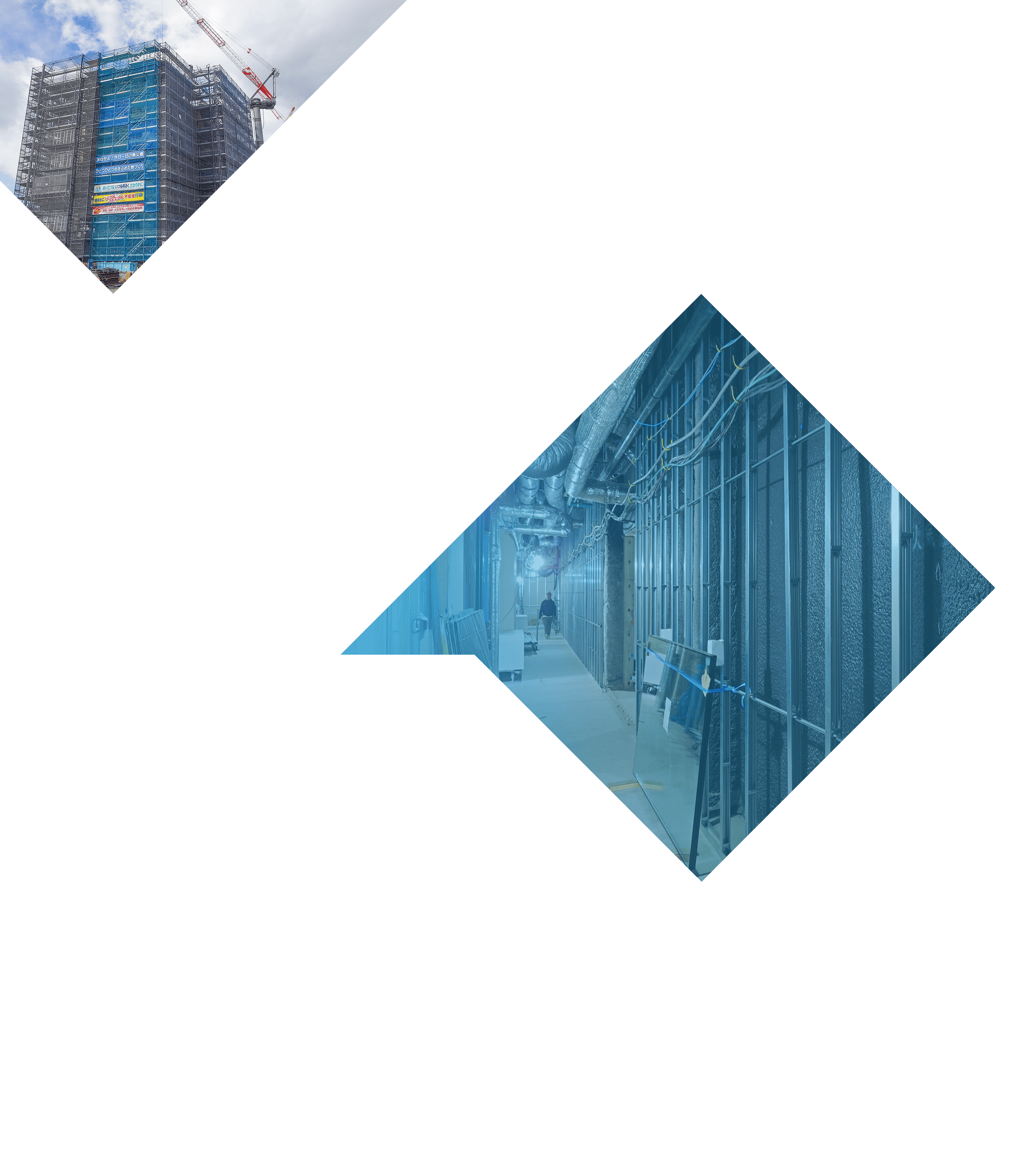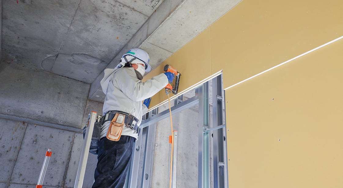 軽鉄ボード工事とは、軽量鉄骨と石膏ボードを組み合わせた下地を使って天井までの柱を立てたり、部屋の間仕切りを作ったりする内装工事のこと。建物の用途やニーズに応じて、耐震天井や鋼製天井、耐火遮音間仕切などの工事も請け負っています。
